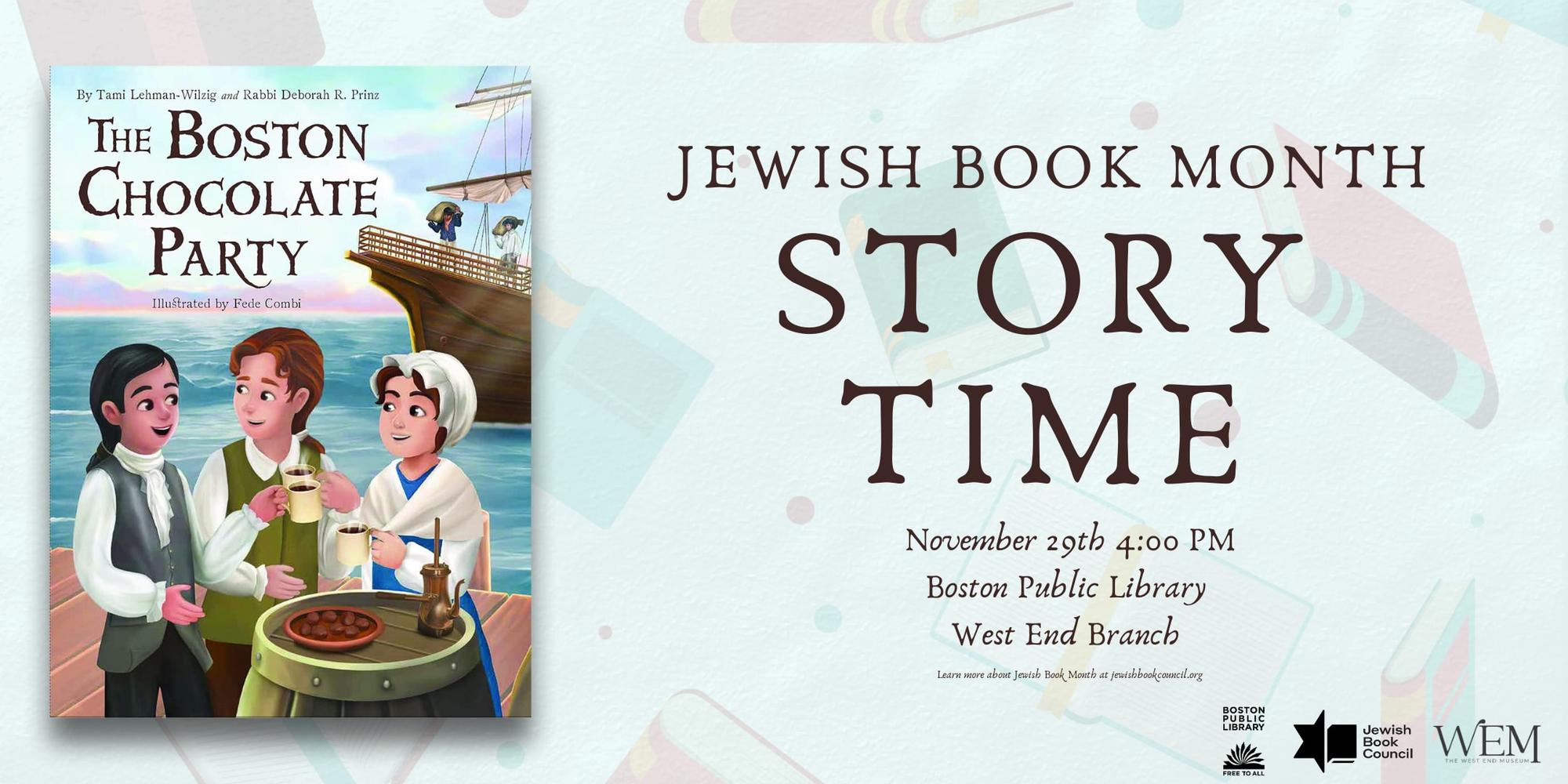 Únase al Jewish Book Council, el West End Museum y la Biblioteca Pública de Boston para leer un libro infantil sobre The Boston Chocolate Party . Escrito por Tami Lehman-Wilzig y la rabina Deborah Prinz e ilustrado por Fede Combi, The Boston Chocolate Party sigue a una familia judía sefardí. Con el telón de fondo de Hanukkah y la lucha estadounidense por la independencia, es una historia de amistad, libertad y amor por el chocolate.