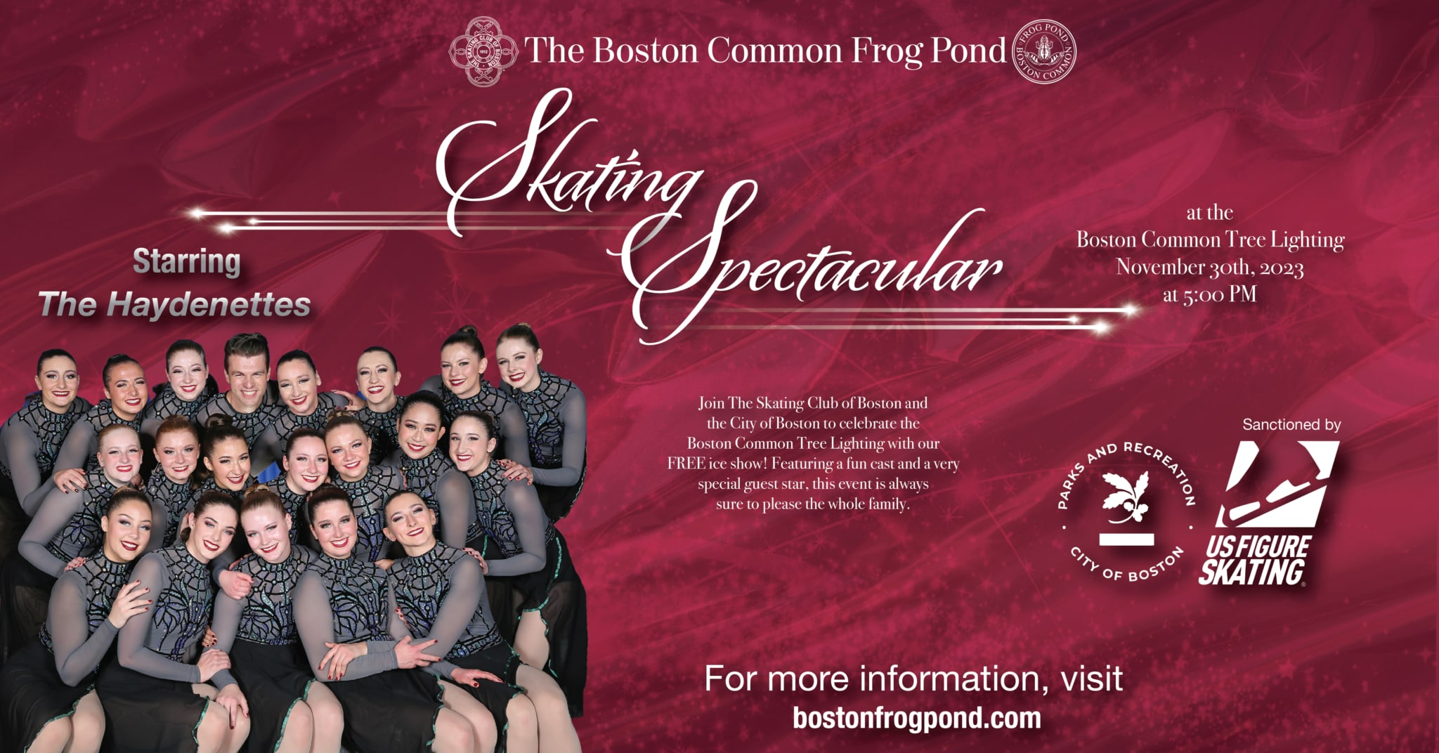 El espectáculo de patinaje Frog Pond se llevará a cabo el jueves 30 de noviembre a las 5:00 pm!. Un espectáculo sobre hielo Gratuito con las Haydenettes del Skating Club of Boston.