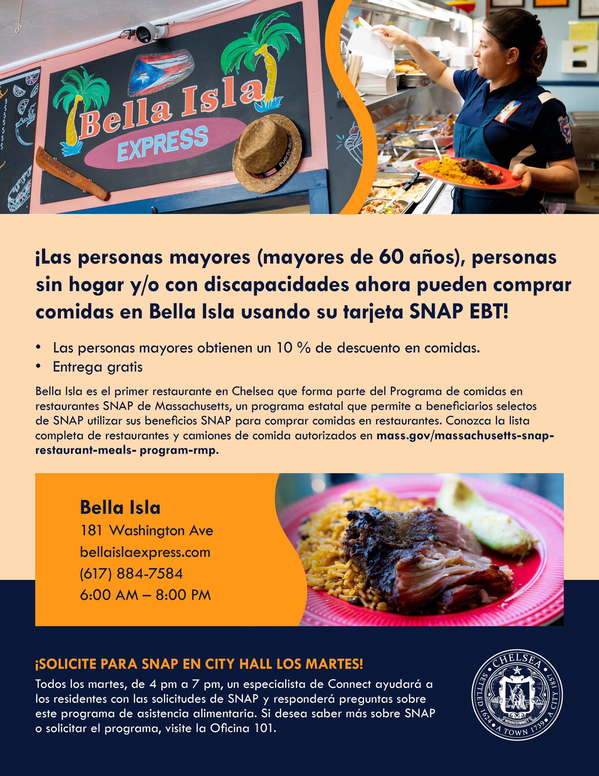 Bella Isla Café es el primer restaurante en Chelsea que forma parte del programa de comidas en restaurantes SNAP de Massachusetts, un programa estatal que permite a beneficiarios selectos de SNAP utilizar sus beneficios para comprar comidas en restaurantes.