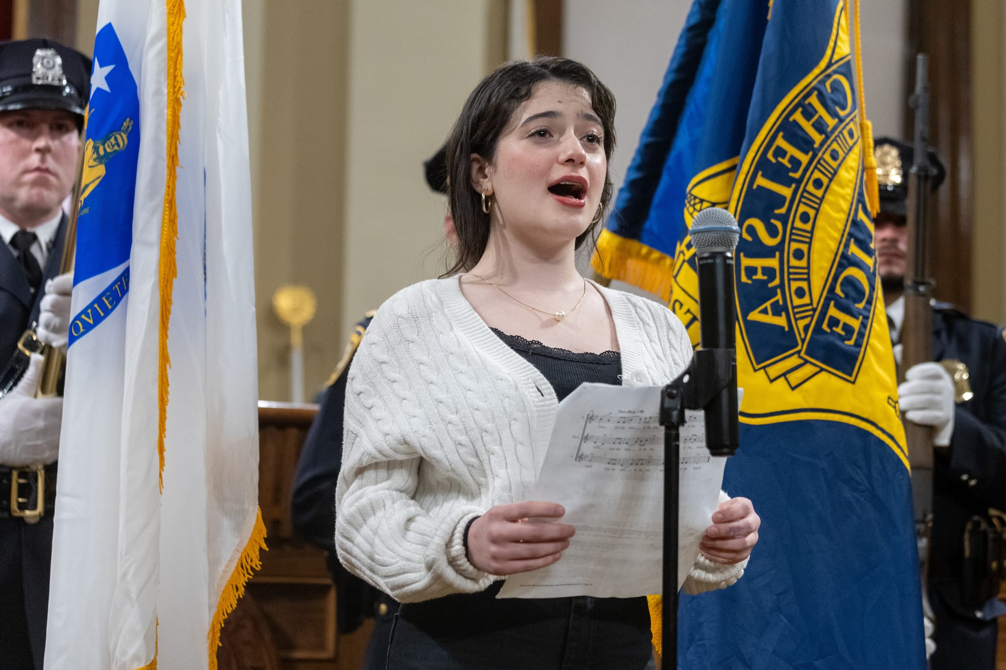 La ceremonia comenzó con la emotiva interpretación del himno nacional por Jayna Singer, estudiante de Chelsea Public Schools, seguida de la recitación del Juramento a la Bandera. Leo Robinson, expresidente del Concejo dirigió esta primera parte del programa.