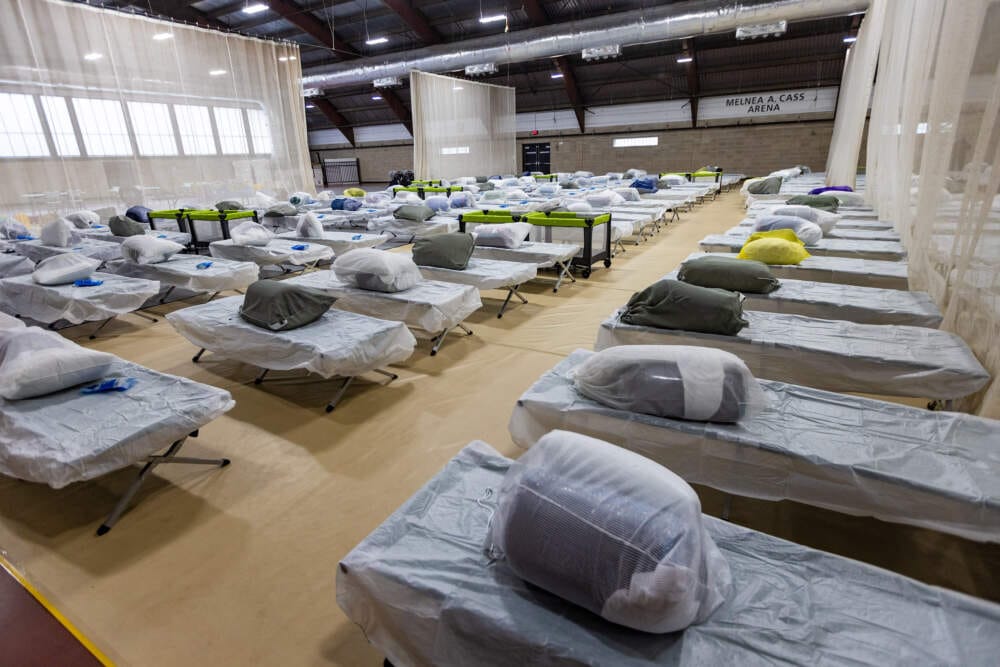Finalmente, consiguieron un lugar en uno de los sitios adicionales que el estado ha establecido para las familias en la lista de espera de refugios. A diferencia de las unidades tradicionales de refugios familiares en Massachusetts, este sitio adicional es un entorno congregado. John estima que hay entre 150 y 200 personas durmiendo en un espacio compartido.