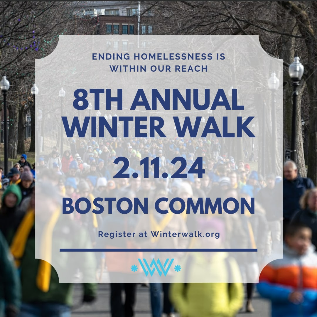 La octava caminata anual de invierno en Boston se llevará a cabo el 11 de febrero de 2024. Esta caminata de 2 millas por las calles de Boston durante el mes más frío del año comenzará y terminará en Boston Common en el campo abierto en la esquina de Beacon y Charles St. Los participantes, con y sin vivienda, caminarán hombro con hombro y luego compartirán una comida juntos mientras escuchan historias reales de la población sin hogar de Boston.