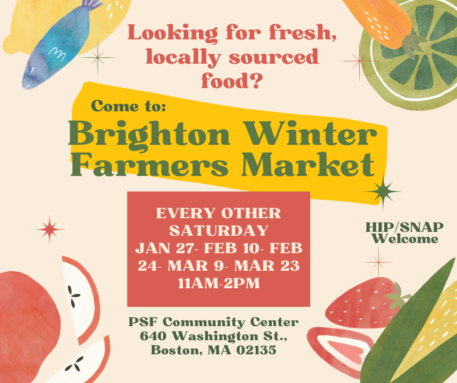 El mercado de agricultores de invierno de 2024 se llevará a cabo cada dos sábados de 11 a 2 pm, en el estacionamiento del Centro Comunitario de PSF (640 Washington Street Brighton, MA 02135).