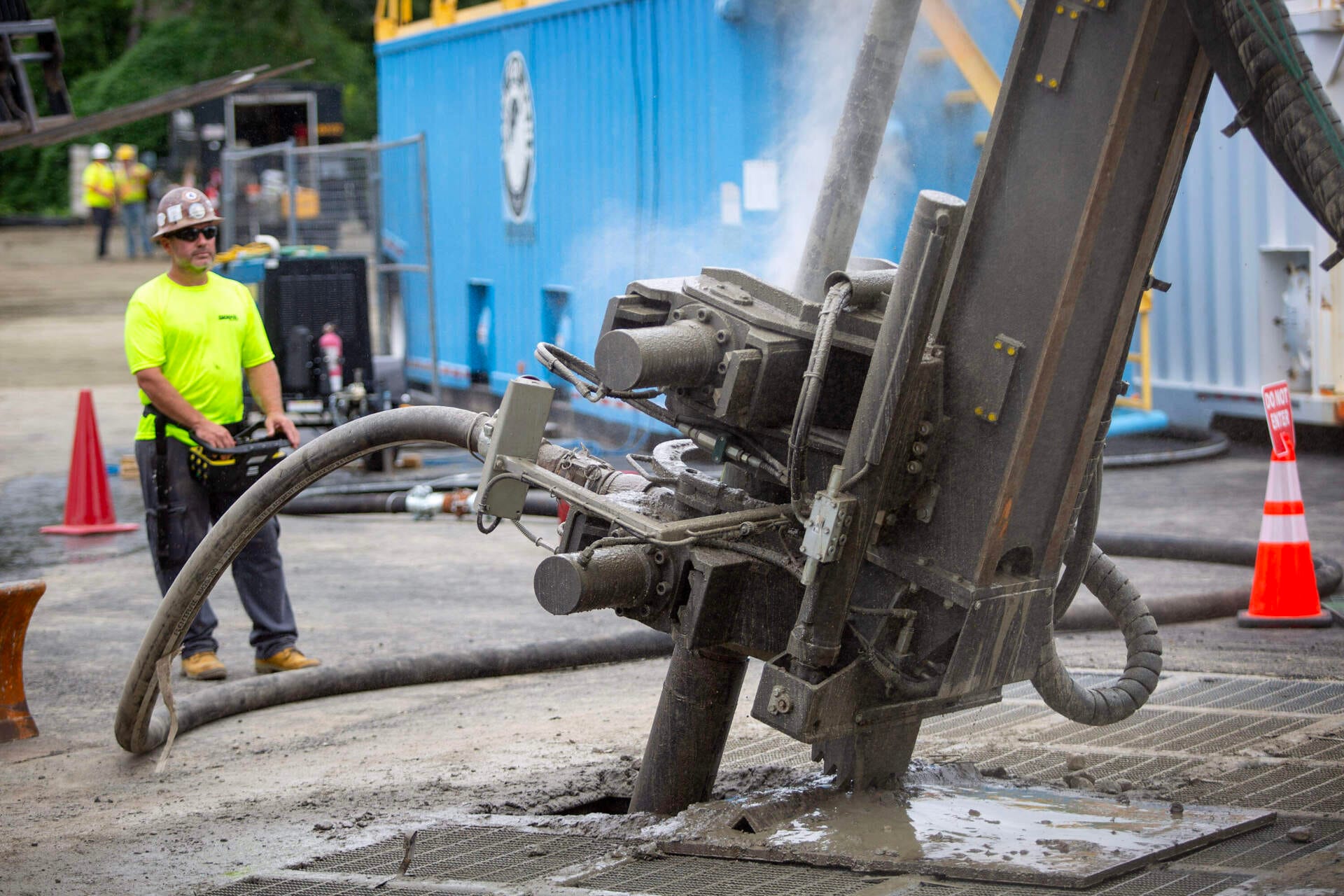 Gritando por encima del ruido, Eric Bosworth, un director de programa del departamento de tecnologías limpias de Eversource, dijo que la perforadora acabaría perforando 650 pies en la tierra.