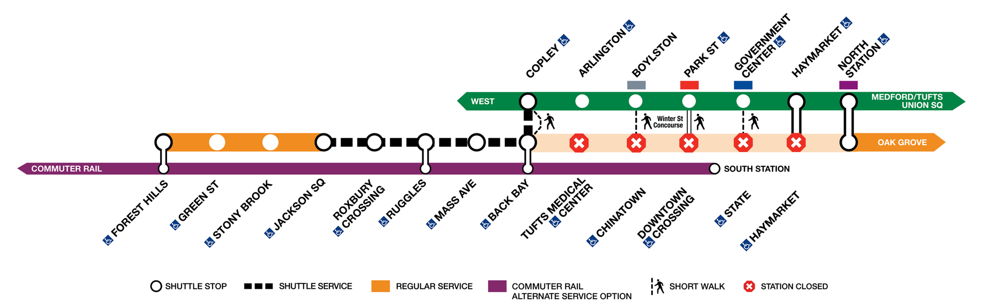 - El commuter Rail será gratuito entre Forest Hills, Ruggles, Back Bay y South Station. Los pasajeros deben tener en cuenta que se deben comprar boletos regulares más allá de Forest Hills.
