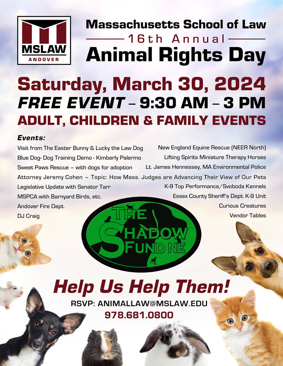 Día de los Derechos de los Animales para Niños y Familias regresa por decimosexto año ! Únase a la Facultad de Derecho de Massachusetts en Andover para disfrutar de un día GRATUITO lleno de diversión, aprendizaje y actividades centradas en los derechos de los animales.