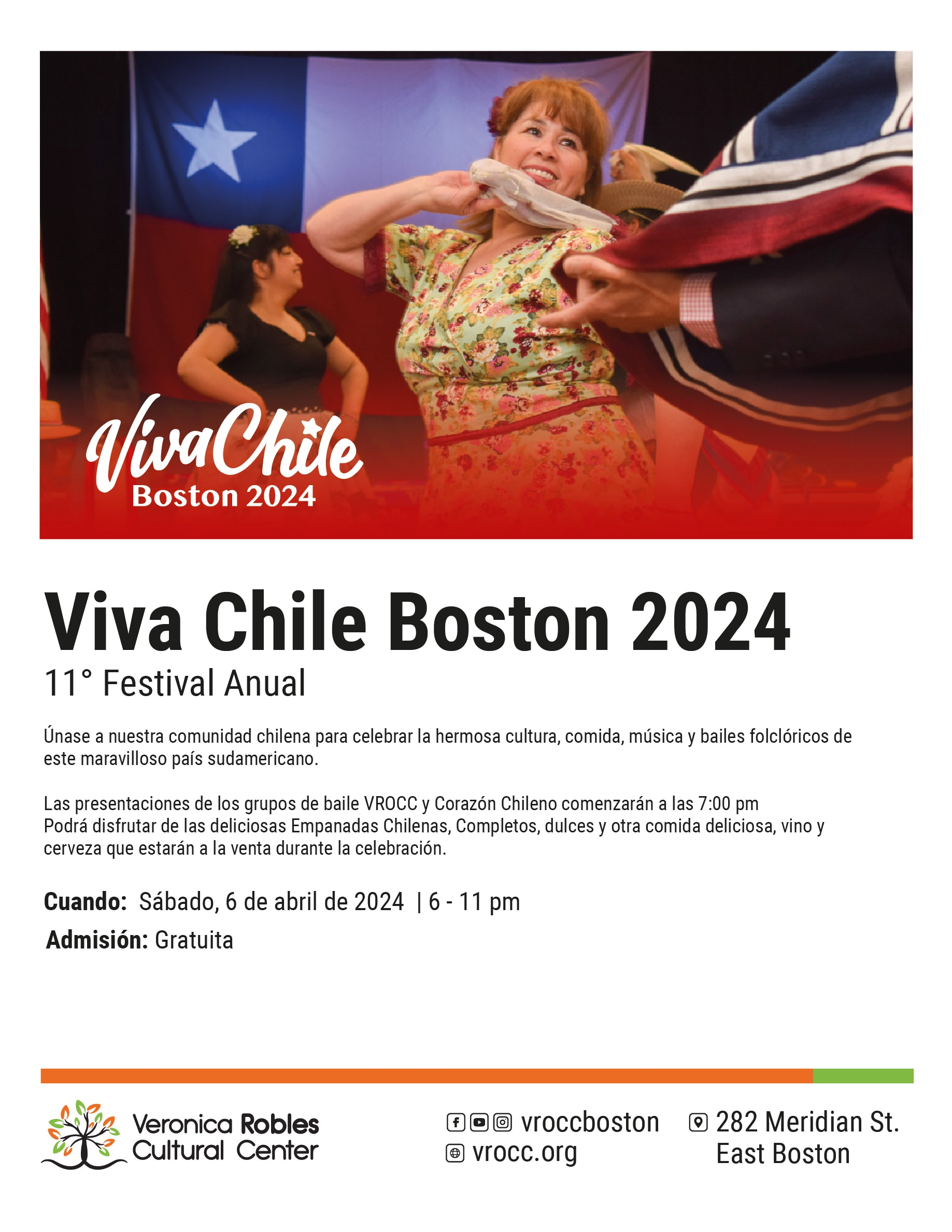 Celebra la cultura chilena en el 11° Festival Anual Viva Chile Boston! Únete a la vibrante comunidad del Centro Cultural Verónica Robles (VROCC) para disfrutar de una noche llena de música, bailes folclóricos y deliciosos sabores de Chile.❤️💙