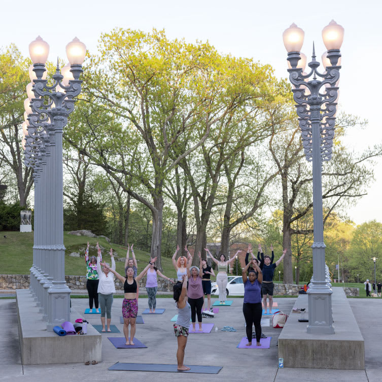Recargue energías en el Rose con yoga en la instalación permanente de Chris Burden, Light of Reason (201, frente a la entrada del museo.
