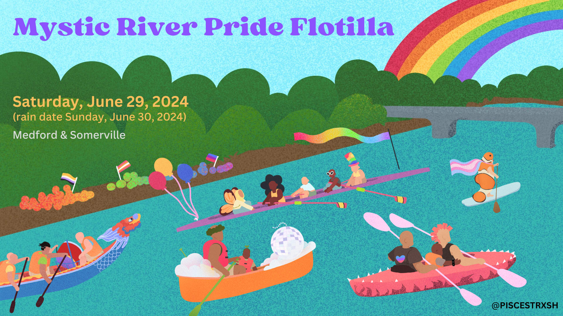 Un maravilloso evento con botes de todo tipo, fabulosamente decorados (canoas, kayaks, tablas de remo, botes de remo, botes dragón, esculturas cinéticas y más) remarán alrededor de la cuenca del río Mystic en Somerville y Medford MA, para celebrar a las personas LGBTQIA+ y sus aliados.