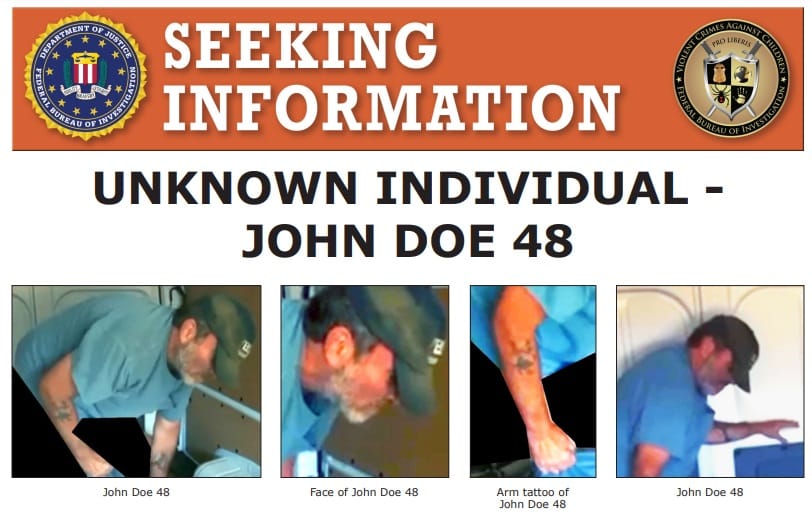 Se están difundiendo al público fotografías y un cartel informativo que representa al individuo desconocido, conocido sólo como John Doe 48, y se pueden encontrar en línea en el sitio web del FBI en fbi.gov/wanted/ecap.