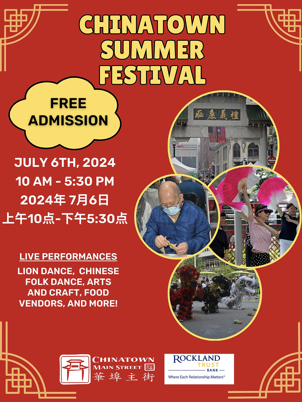 Únase a Chinatown Main Street y al resto de la comunidad de Chinatown para el Festival de Verano Anual de CMS el sábado 6 de julio de 2024. Habrá varias presentaciones culturales, como danza del león, danza folclórica china, artes marciales, etc.