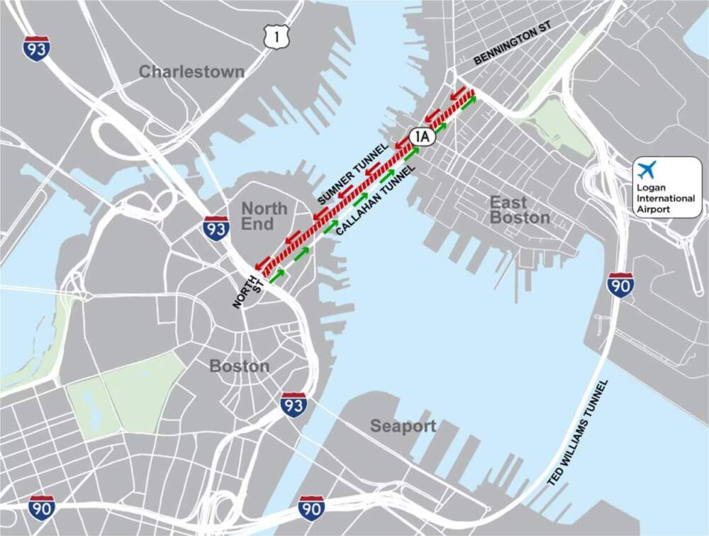 La opción principal de desvío para los conductores que van hacia el oeste desde East Boston y el Aeropuerto Logan es el túnel Ted Williams, que conecta con la I-93 y la I-90. Los conductores también pueden tomar la Ruta 1A hacia el norte desde East Boston hacia North Shore, New Hampshire y Maine. Y los viajeros de North Shore aún pueden tomar el puente Tobin si se dirigen hacia Boston. (MassDOT tiene varios mapas de desvíos aquí y un panel que muestra los tiempos de viaje promedio).