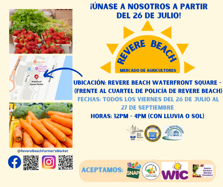 A partir del viernes, 26 de julio, la Ciudad de Revere, en colaboración con el Departamento de Salud Pública de la Ciudad, Next Stop Revere, Revere Beach Partnership, y varios vendedores locales, será el anfitrión de un gran mercado de agricultores en una nueva ubicación Revere Beach.