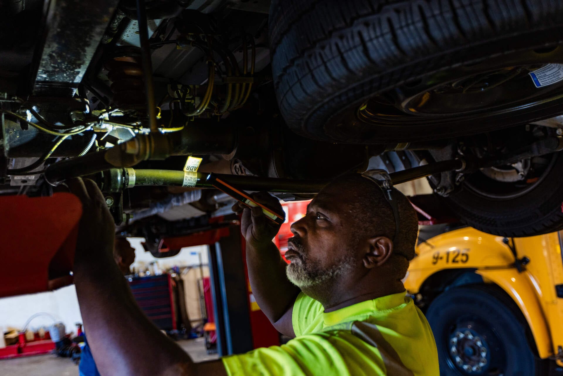 Dentro del taller de reparación de autobuses de Worcester Public Schools, Jim Hicks inspecciona una furgoneta de transporte escolar mientras está elevada sobre su cabeza por un elevador electrónico de autos.