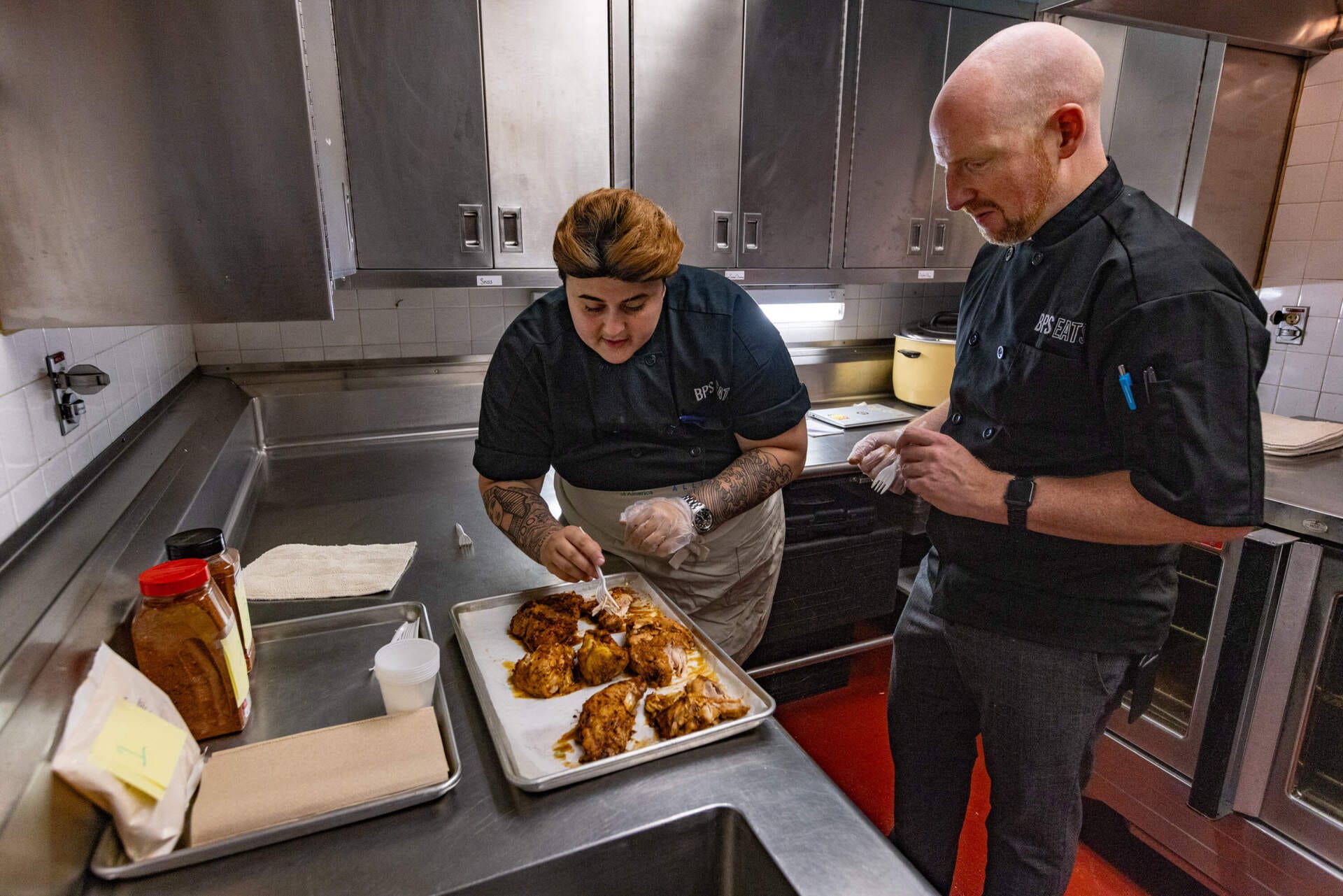 Urbanetti, subdirector de programas culinarios de las Escuelas Públicas de Boston, y Alexis Assad, gerente culinaria del distrito, toman pequeños bocados de cada muslo de pollo. Ha comenzado una pequeña competencia de prueba de sabor.