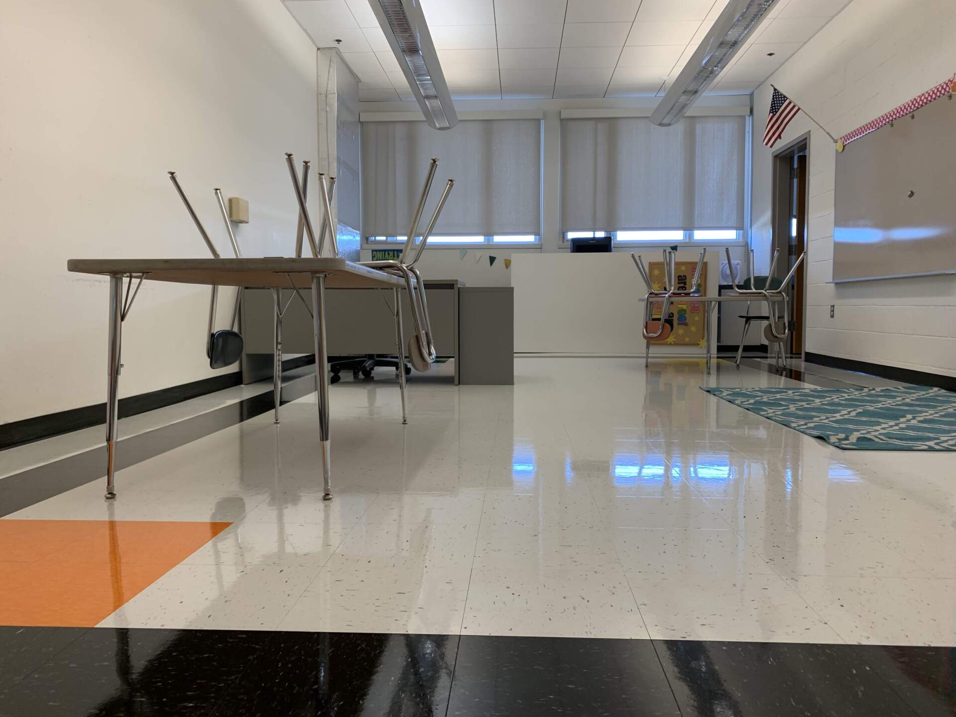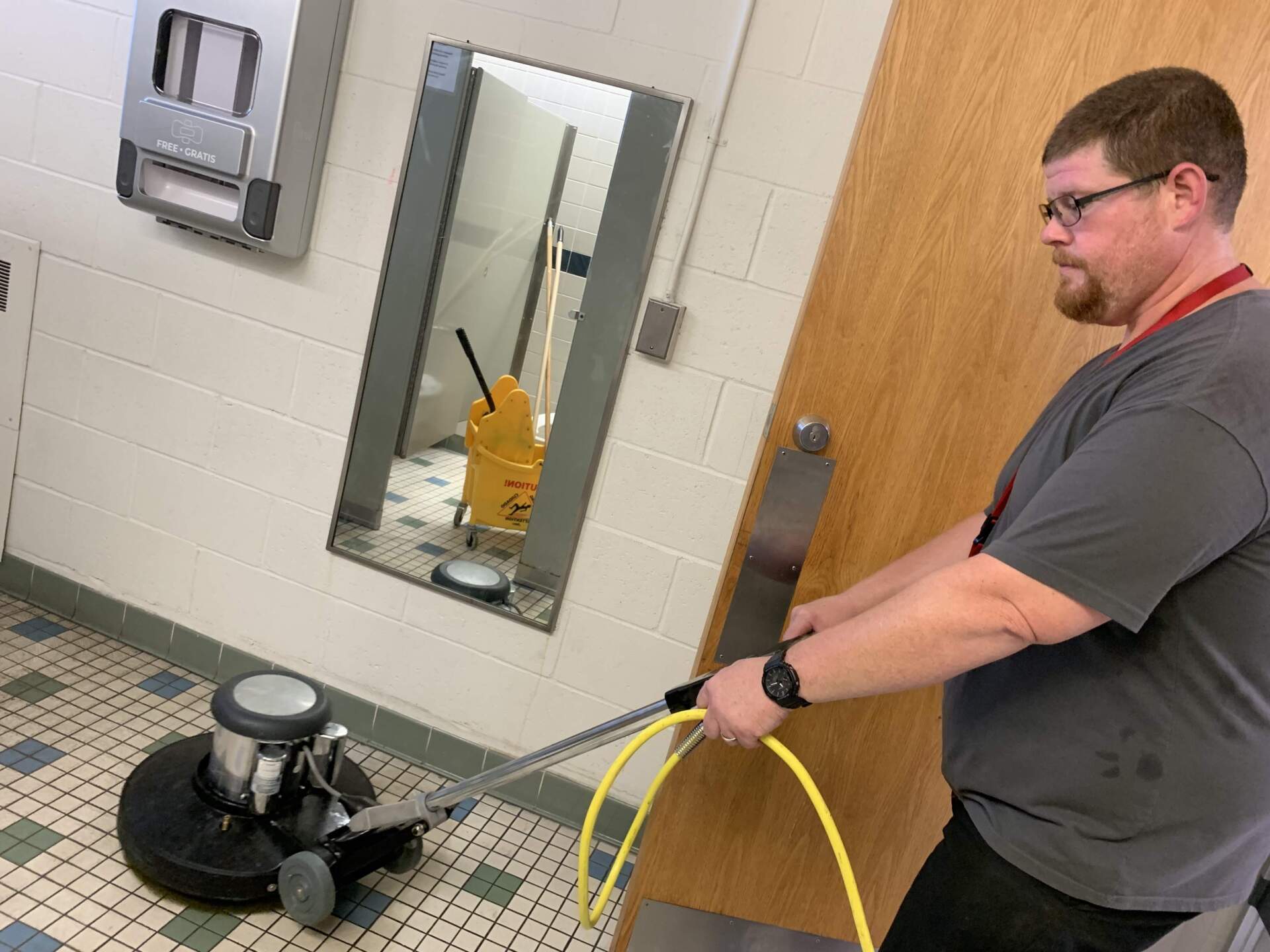 En una visita reciente, Lowe y dos compañeros del personal de limpieza explicaron que comienzan puliendo y encerando los pisos de las aulas hasta que están tan brillantes que puedes ver tu reflejo.