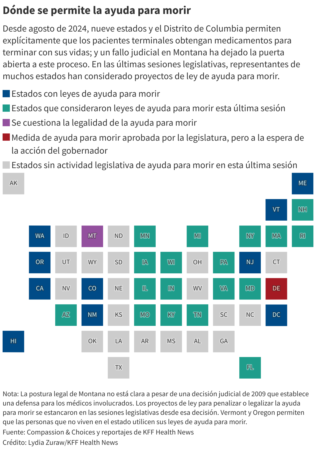 Pero Vermont eliminó su requisito de residencia en mayo de 2023, seguido de Oregon dos meses después. (Montana permite la muerte asistida en virtud de una decisión judicial de 2009, pero ese fallo no establece normas sobre la residencia. Y aunque Nueva York y California consideraron recientemente una legislación que permitiría a los residentes fuera del estado acceder a la ayuda médica para morir, ninguna de las dos disposiciones fue aprobada).