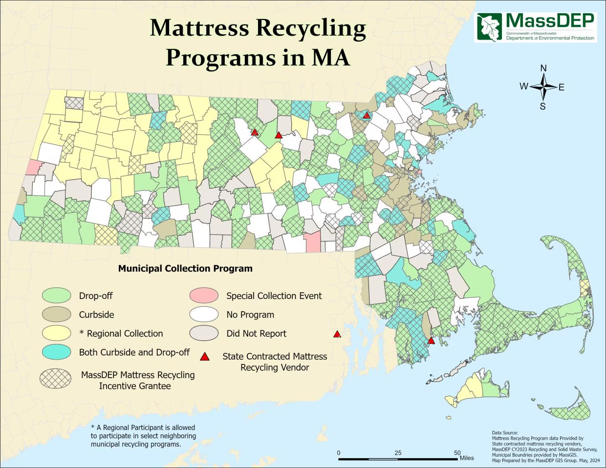 El mapa a continuación muestra las comunidades de Massachusetts que han notificado al MassDEP que ofrecen servicios de reciclaje de colchones.