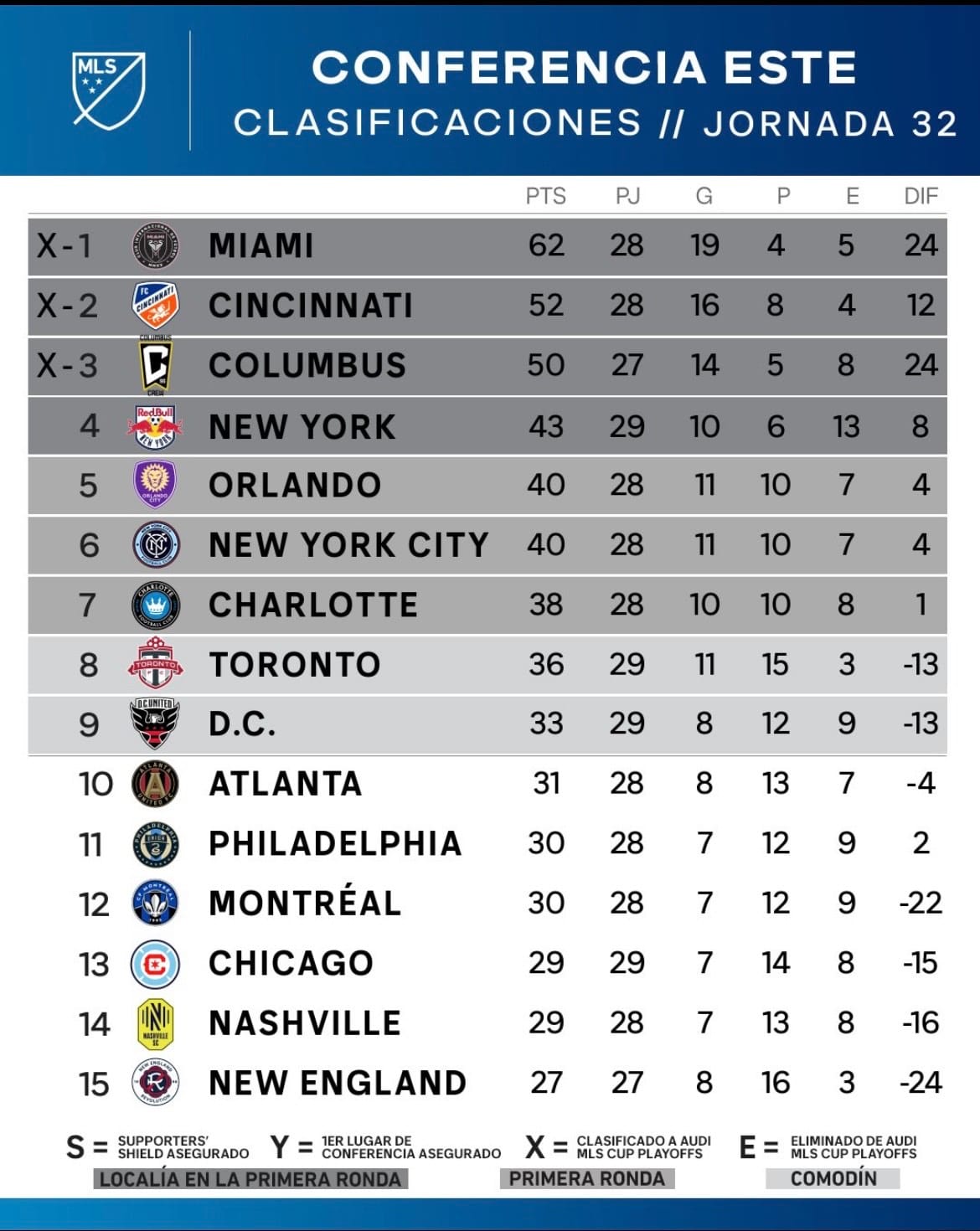 El Revolution está a 7 puntos del noveno lugar (DC United, 33 puntos, puesto de repechaje), y a once puntos del séptimo lugar (Charlotte, 38 puntos, puesto de clasificación directa a playoffs).