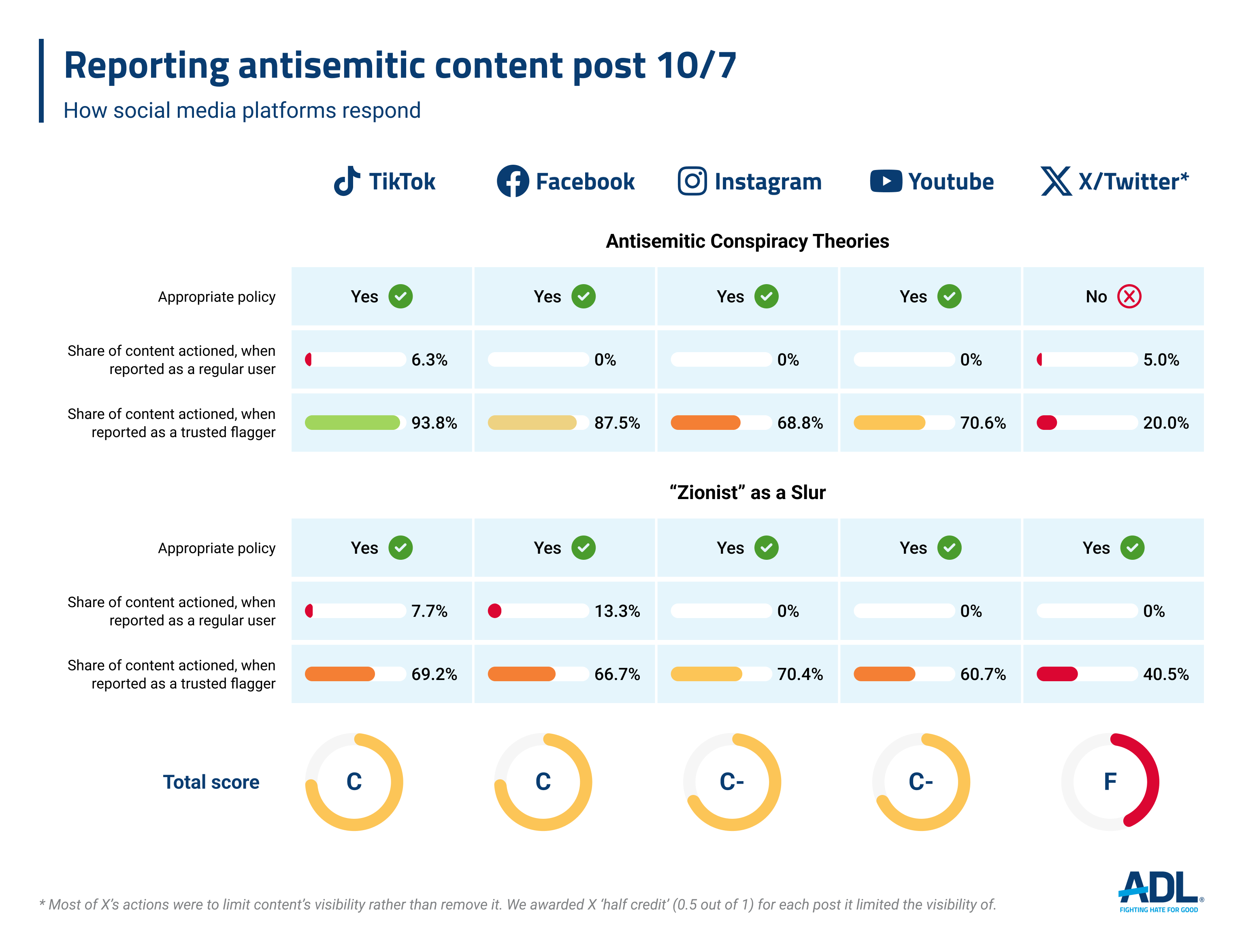 X (antes Twitter) obtuvo la puntuación más baja con una “F”, ya que la mayoría de las acciones de la plataforma consistieron en limitar la visibilidad de los contenidos problemáticos. Aunque  ADL reconoció que X había tomado medidas, a diferencia de otras plataformas, X no eliminó el contenido que incitaba al odio. Además, Facebook y TikTok recibieron una “C” cada una; YouTube e Instagram obtuvieron una “C- “.