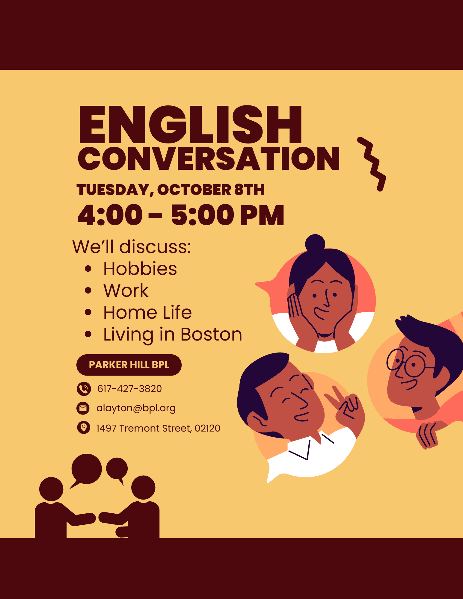 Durante cada sesión, el grupo tendrá una conversación guiada sobre temas relevantes elegidos, como el trabajo, la vida en Boston, los pasatiempos, la vida familiar y más.