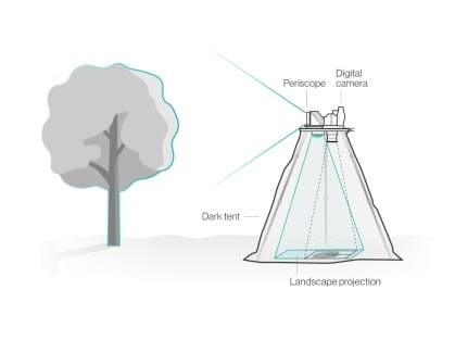 Las singulares obras de Abelardo Morell se logran mediante el uso de una Tienda/Cámara que él ha adaptado para integrar el dispositivo centenario llamado cámara oscura (similar a una cámara estenopeica) con tecnología de vanguardia que le permite captar vistas lejanas y yuxtaponerlas con los aspectos granulares de un lugar en un único momento en el tiempo.