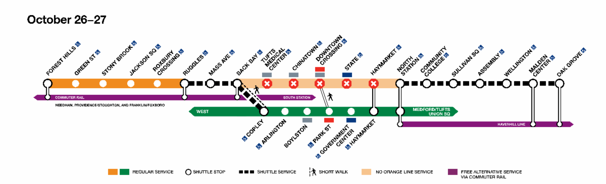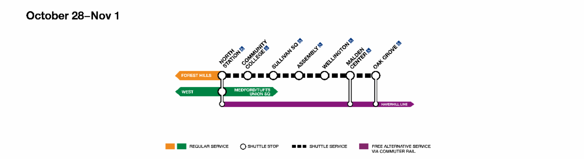 - También se recomienda a los pasajeros que consideren el tren de cercanías para un servicio gratuito entre South Station y Forest Hills, así como un servicio gratuito entre Oak Grove y North Station.