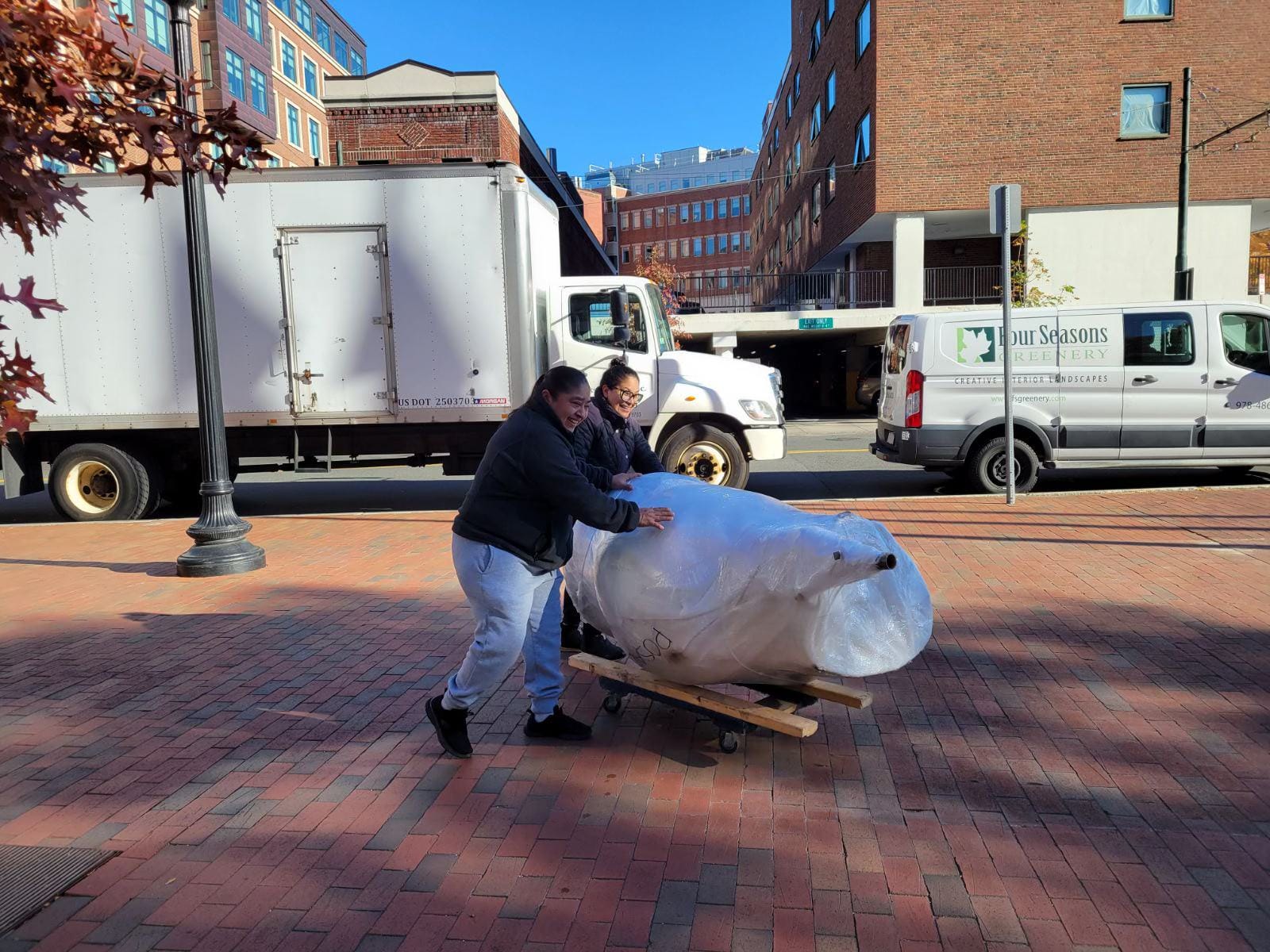 Equipo del Veronica Robles Cultural Center (VRCC) instalando Catrina monumental de Atlixco en Harvard Square. Foto: Cortesía Verónica Robles.