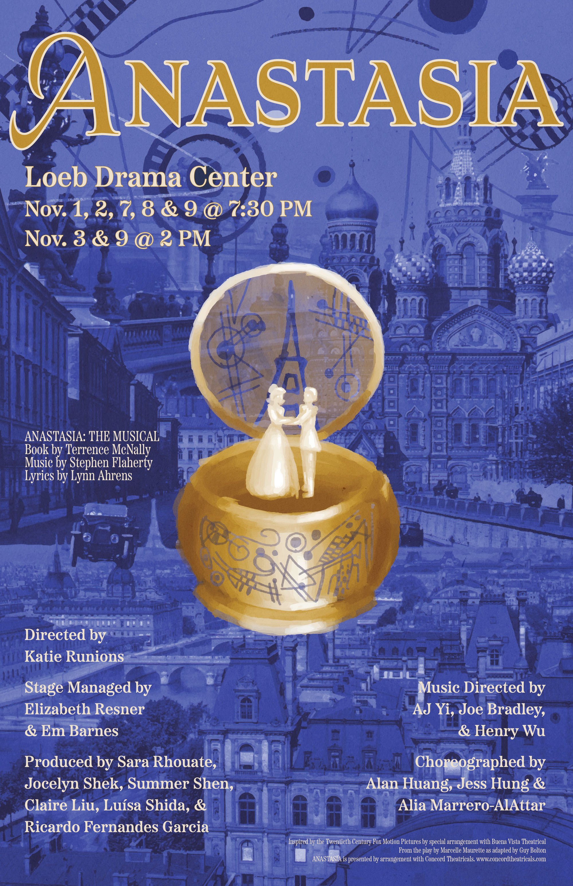 ¡Embárcate en un viaje mágico al pasado con la producción de Harvard de Anastasia, el musical! La historia sigue el misterio de la princesa Anastasia Romanov, quien supuestamente sobrevivió a la infame ejecución de su familia.