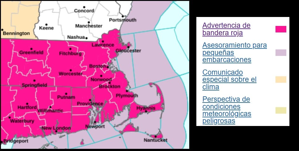 Hay una advertencia de bandera roja vigente para MA, RI y CT hasta las 6 p. m. de esta noche.