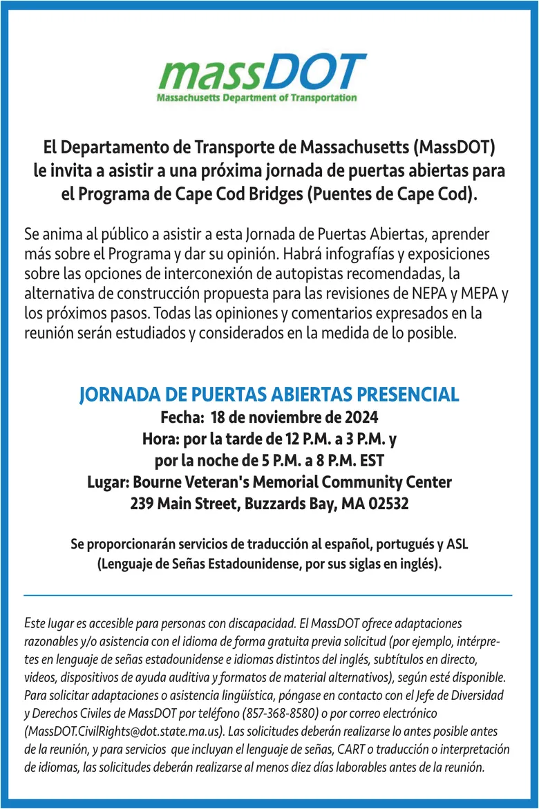 El Departamento de Transporte de Massachusetts (MassDOT) le invita a asistir a una próxima jornada de puertas abiertas para el Programa de Cape Cod Bridges (Puentes de Cape Cod). Se anima al público a asistir a esta Jornada de Puertas Abiertas, aprender más sobre el Programa y dar su opinión.