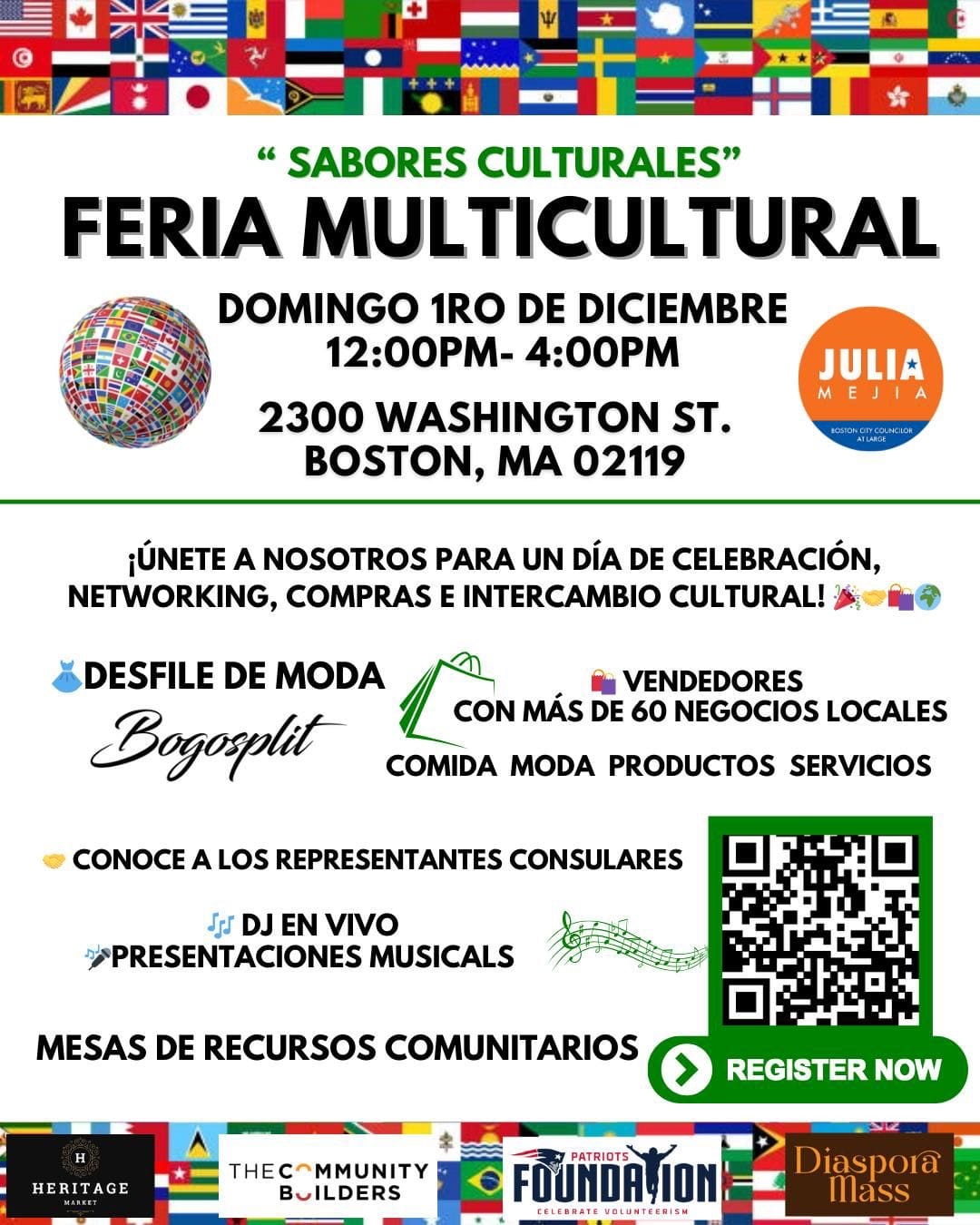 Este domingo 1 de diciembre, la ciudad de Boston será escenario de una vibrante celebración multicultural durante la feria “Sabores Culturales”, un evento organizado por la Oficina de la concejal de Boston Julia Mejía que promete ser un encuentro único de cultura, gastronomía y comunidad.