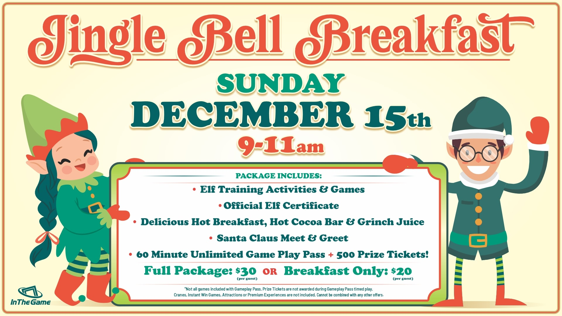 Este año, los niños que asistan al desayuno Jingle Bell se convertirán en elfos oficiales en nuestra Academia de entrenamiento de elfos para obtener su certificado y sombrero de elfo.