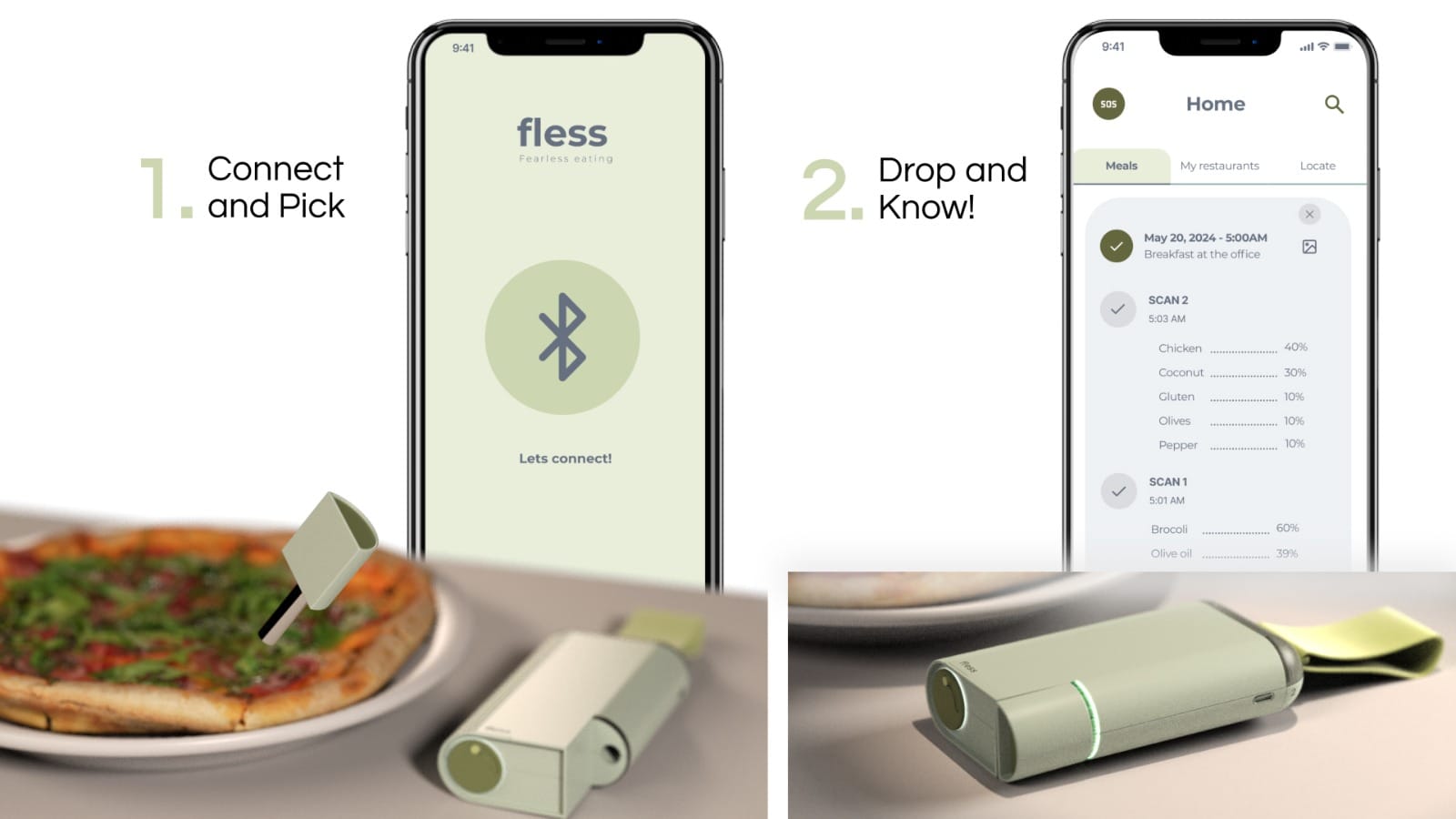 Uno de sus proyectos más notables es Fless, un dispositivo conceptual portátil que identifica alérgenos en alimentos mediante espectrofotometría. Esta herramienta ofrece una solución confiable y discreta para millones de personas con alergias, permitiendo pruebas ilimitadas y funciones complementarias como recomendaciones de restaurantes y un botón de emergencias.