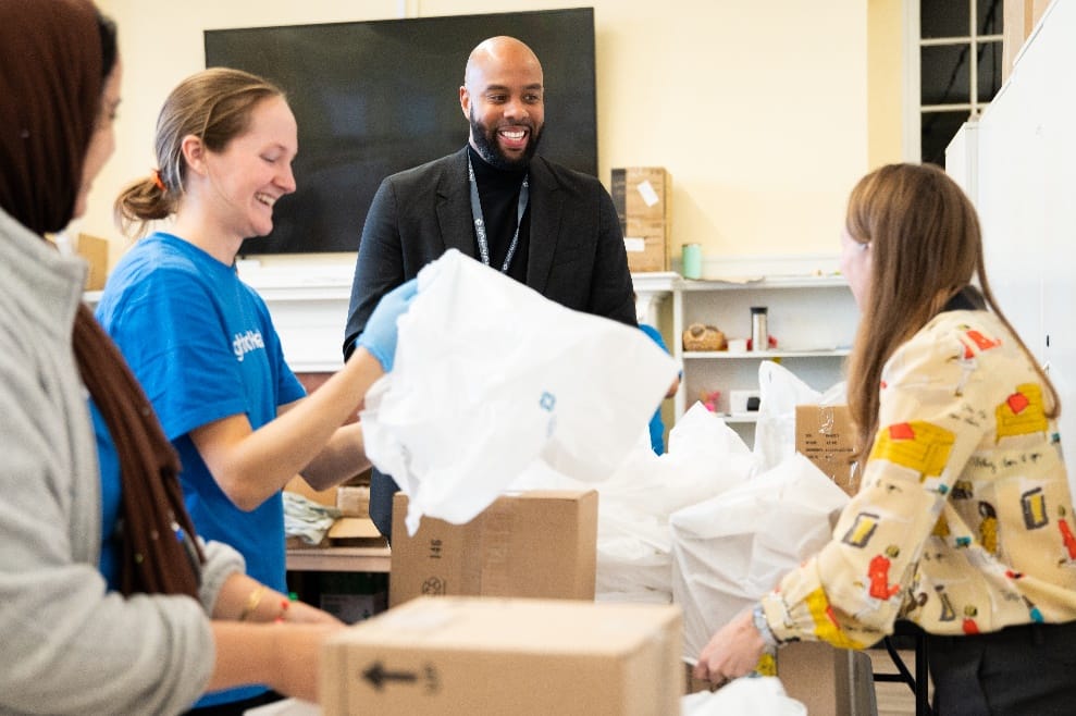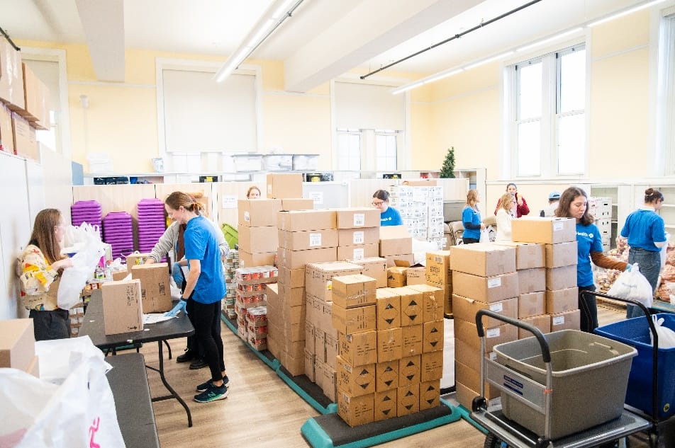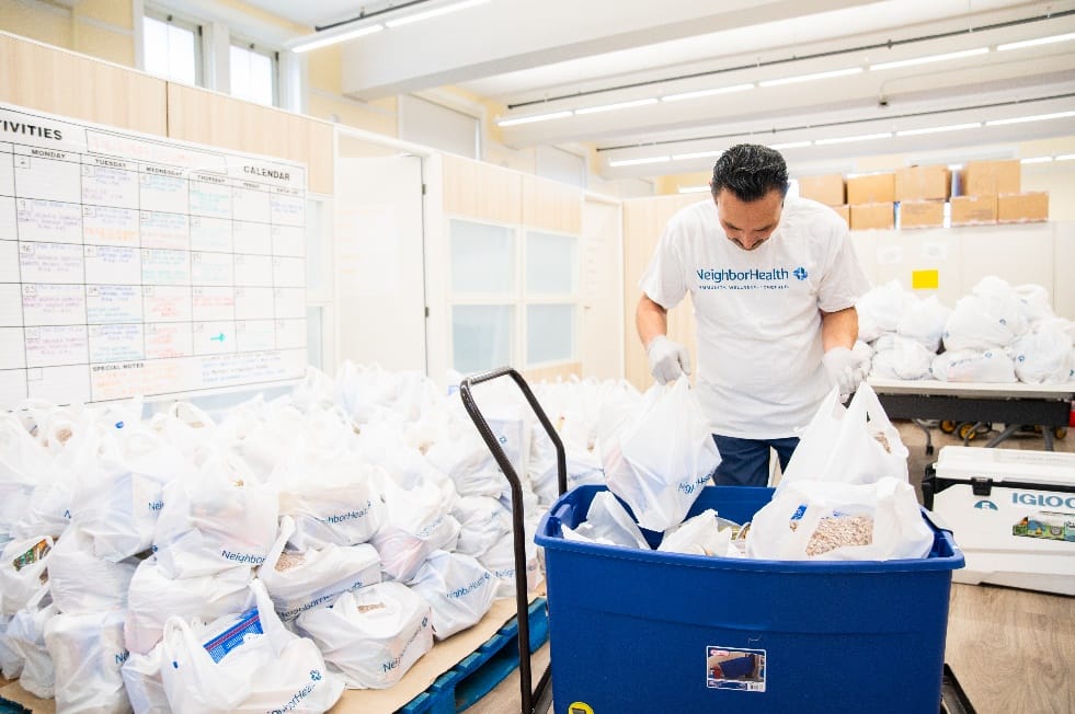 El jueves 19 de diciembre, los voluntarios del Centro Comunitario de Recursos y Bienestar de NeighborHealth prepararon y distribuyeron 900 bolsas de alimentos para familias y residentes de la comunidad en celebración de las fiestas.