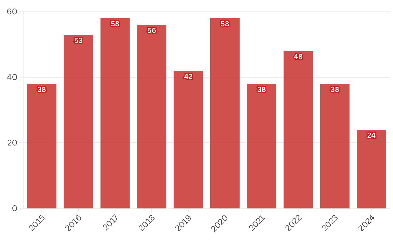 Pero los números no han bajado en todas partes. Worcester ha contado hasta ahora 16 homicidios, un aumento respecto a los seis del año pasado y el número más alto en décadas. Pittsfield ha tenido un homicidio este año, el mismo que en 2023. No se disponía de cifras de inmediato de la policía estatal, que maneja las investigaciones de asesinatos en el resto del estado.