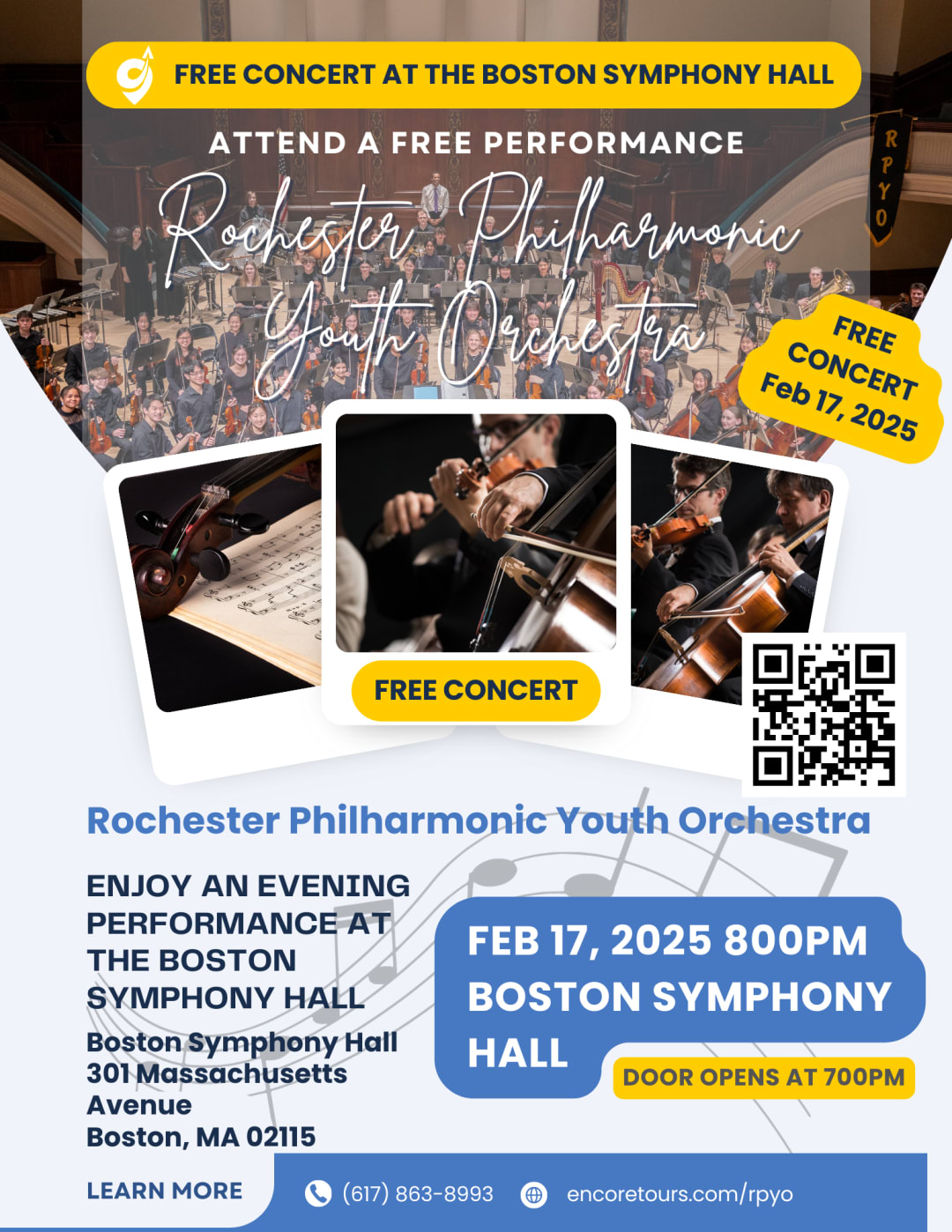Disfrute de una velada inolvidable con la Orquesta Filarmónica Juvenil de Rochester (RPYO) en su actuación en el legendario Boston Symphony Hall !