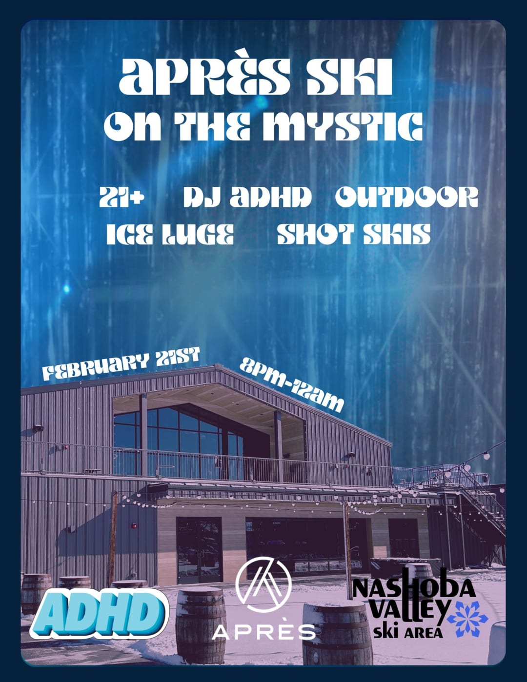 Baila toda la noche en Après-ski en Mystic, con el infame Après Ski europeo a Medford con esquís de tiro, un trineo de hielo, DJ ADHD, bebida festiva y ambiente inolvidable.