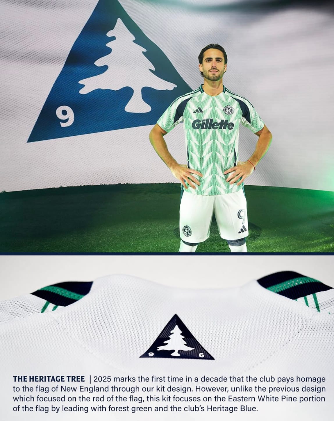 El partido inaugural del Revolution esta temporada 2025 ante Nashville también servirá para que el club estrene oficialmente su nueva indumentaria, a la cual bautizaron con el nombre de «Pino blanco del este» (Eastern White Pine Kit en inglés).
