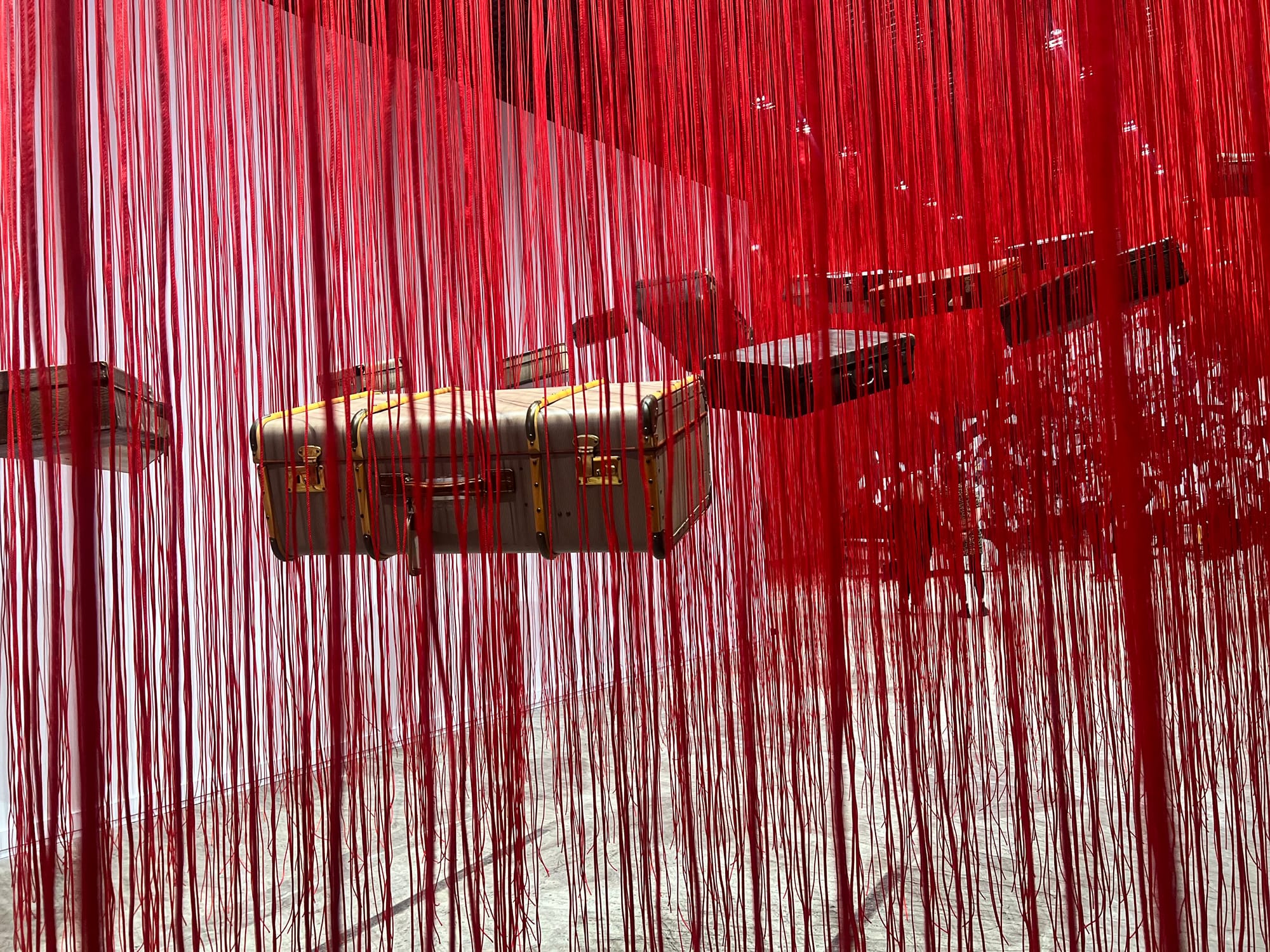 En Home Less Home, Shiota utiliza cuerdas rojas y negras, maletas, muebles, documentos y cartas para hablar del hogar, la migración y cómo construimos nuestras memorias a través de los lugares que dejamos atrás y los que adoptamos como propios.