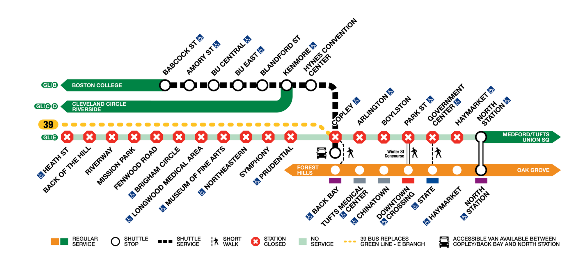 Mientras las líneas están en mantenimiento, el MBTA sugiere el uso de la línea naranja para las posibles rutas. También estarán ofreciendo servicio ferroviario regional gratuito en la línea de Worcester desde la estación Lansdowne hasta las estaciones de Back Bay y South Station. Entre las diferentes estaciones cerradas, estarán ofreciendo diferentes alternativas.
