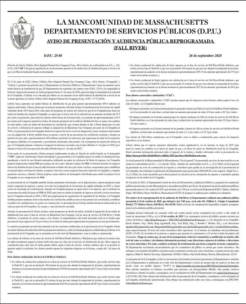 AVISO DE PRESENTACIÓN Y AUDIENCIA PÚBLICA REPROGRAMADA (FALL RIVER)