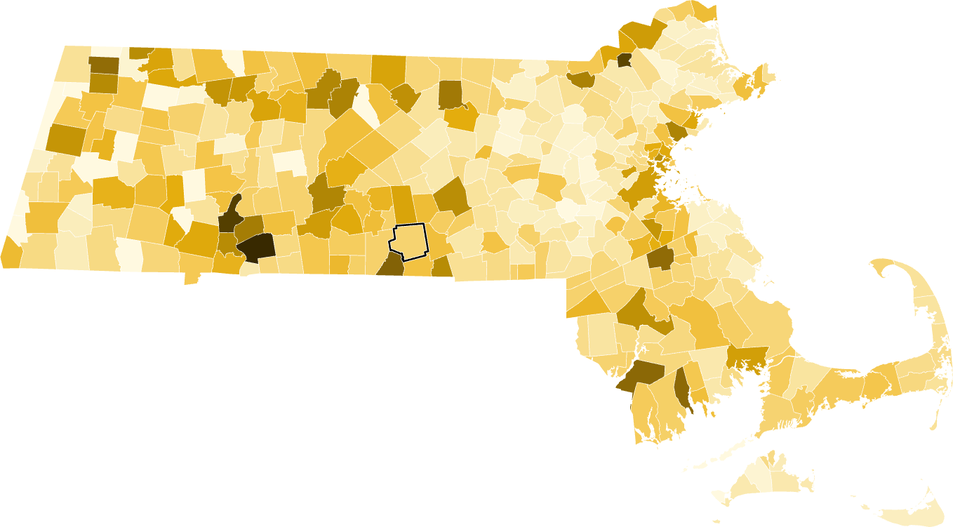 Los beneficios de SNAP son utilizados por personas en todo el estado. El mapa a continuación muestra el porcentaje de residentes de cada municipio que recibe asistencia alimentaria financiada por el gobierno federal.