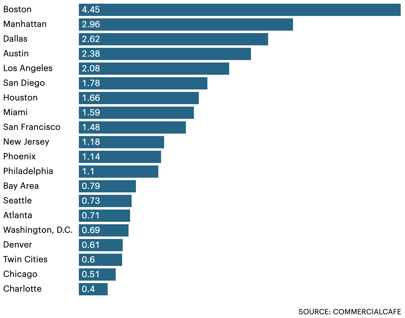 Un nuevo informe de la plataforma CommercialCafe de Yardi indica que el área de Boston tiene 4.45 millones de pies cuadrados de oficinas en construcción. En un lejano segundo lugar se encuentra Manhattan, con poco menos de 3 millones, seguida por Dallas, Austin y Los Ángeles.