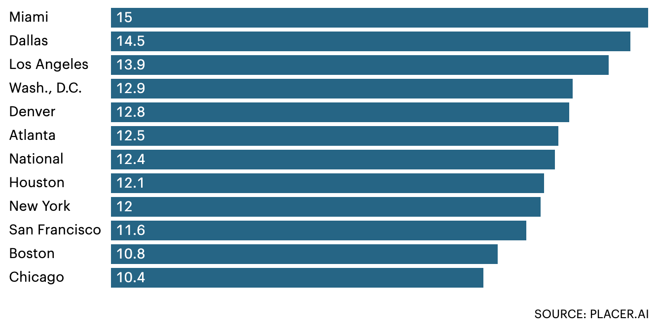 Boston también está rezagada en cuanto al nivel de actividad en las oficinas comparado con los días previos a la pandemia. Las visitas a oficinas en octubre bajaron un 40.5% en comparación con el mismo mes de 2019. De las 11 áreas metropolitanas analizadas por Placer.ai, solo San Francisco y Chicago están aún más atrás. Miami es la que mejor se desempeña en ese grupo, con una caída de solo 10.2%.