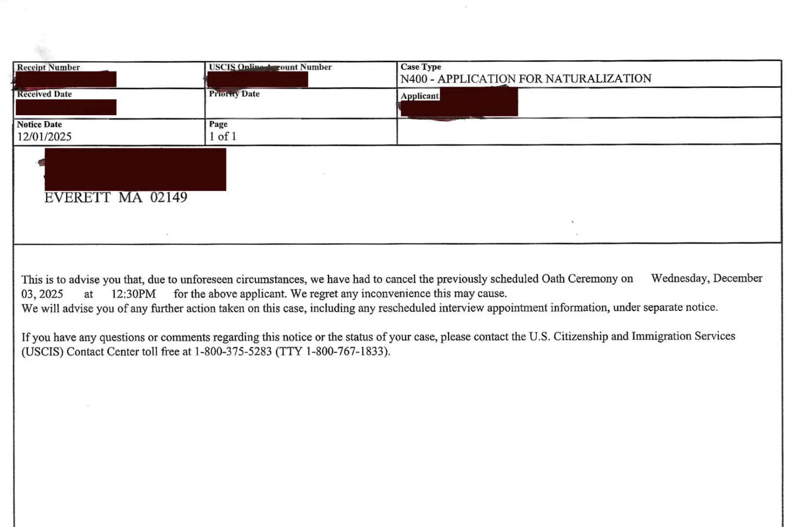 Muchos titulares de tarjetas de residencia que esperan la programación de sus ceremonias de juramento están siendo notificados sobre cancelaciones lentamente a través de un portal en línea. La ceremonia de juramento puede realizarse en una oficina del USCIS, pero también puede tener lugar en lugares más grandes, como un juzgado o Faneuil Hall, donde el público puede presenciarla. Normalmente, los residentes permanentes asisten acompañados de familiares y amigos.