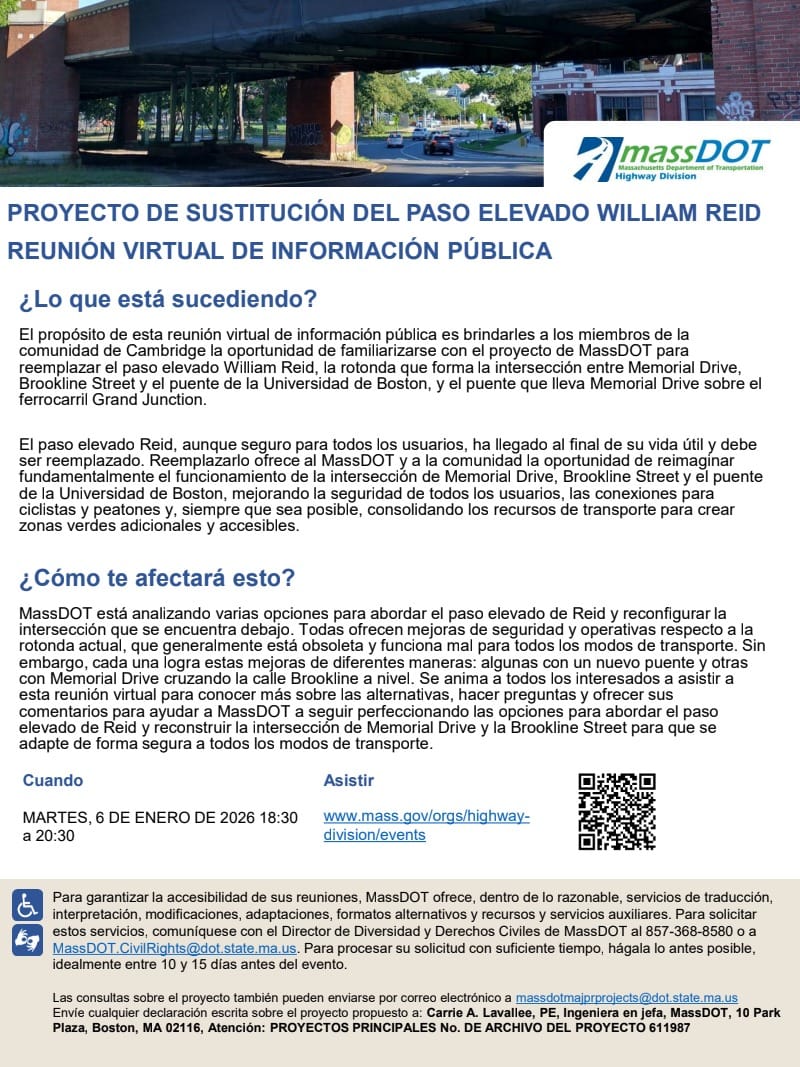 MassDOT está analizando varias opciones para abordar el paso elevado de Reid y reconfigurar la intersección que se encuentra debajo. Todas ofrecen mejoras de seguridad y operativas respecto a la rotonda actual, que generalmente está obsoleta y funciona mal para todos los modos de transporte. Sin embargo, cada una logra estas mejoras de diferentes maneras: algunas con un nuevo puente y otras con Memorial Drive cruzando la calle Brookline a nivel. Se anima a todos los interesados a asistir a esta reunión virtual para conocer más sobre las alternativas, hacer preguntas y ofrecer sus comentarios para ayudar a MassDOT a seguir perfeccionando las opciones para abordar el paso elevado de Reid y reconstruir la intersección de Memorial Drive y la Brookline Street para que se adapte de forma segura a todos los modos de transporte. link aquí.