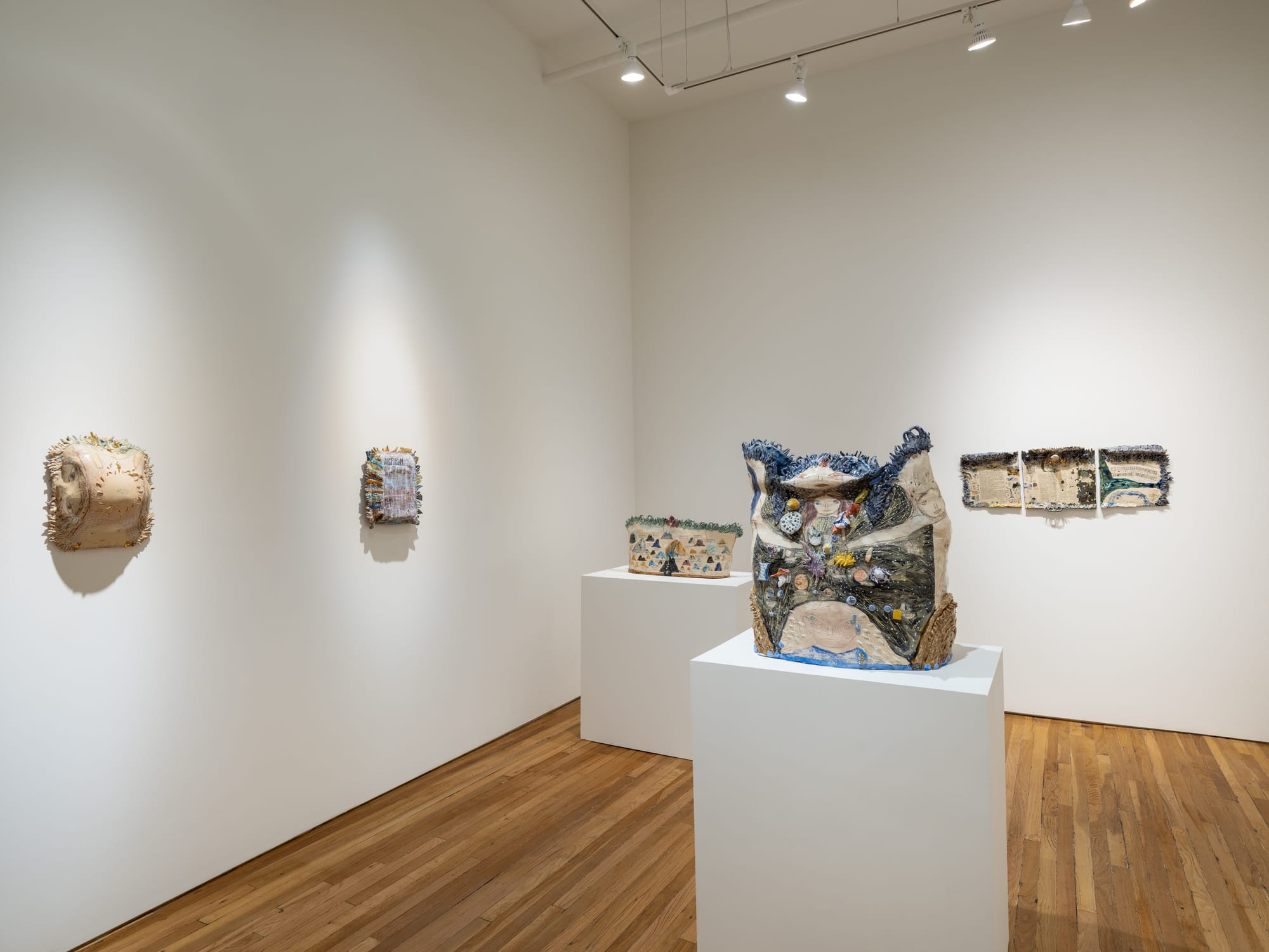 El artista parte de una idea central: el pasado no es fijo ni lineal, sino una superposición de relatos, versiones y recuerdos que cambian con el tiempo. Esa idea se materializa en sus esculturas de arcilla, modeladas a mano y cocidas en horno, que parecen objetos antiguos descubiertos en el futuro. Son piezas llenas de inscripciones, figuras, capas de color y referencias culturales, como si cada una guardara múltiples historias al mismo tiempo. Además, el fuego, los esmaltes, los pigmentos e incluso el oro cambian la superficie de las obras de forma inesperada, como si imitara la memoria: Algunas partes desaparecen, otras se destacan y otras cambian su significado.