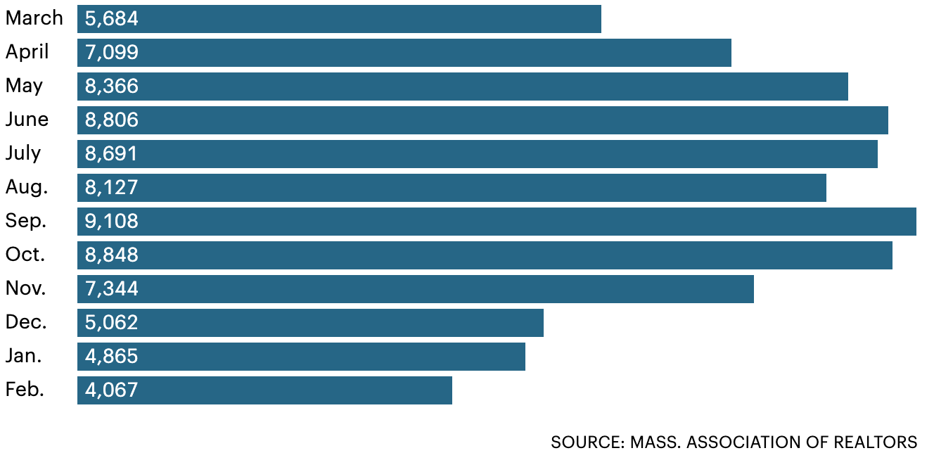 El área de Boston y gran parte de Nueva Inglaterra vivieron un invierno inusualmente frío y con mucha nieve, lo que se atribuye a la reducción de una oferta de viviendas que ya era escasa en el mercado. A continuación, se muestran los listados de cada uno de los últimos 12 meses.