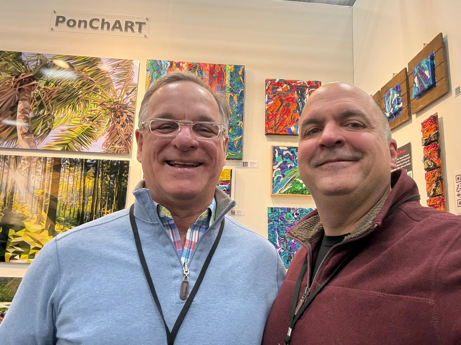 Uno pinta arrodillado frente al océano, mezclando acrílico con arena de playa y agua de mar. El otro trabaja con precisión matemática, descomponiendo un paisaje en cientos de triángulos de color hasta capturar exactamente cómo la luz cambia dependiendo de la latitud. Carlos Ponce y Alejandro Chávez son dos venezolanos que residen en Massachusetts, y este fin de semana exhiben juntos en Artexpo New York.